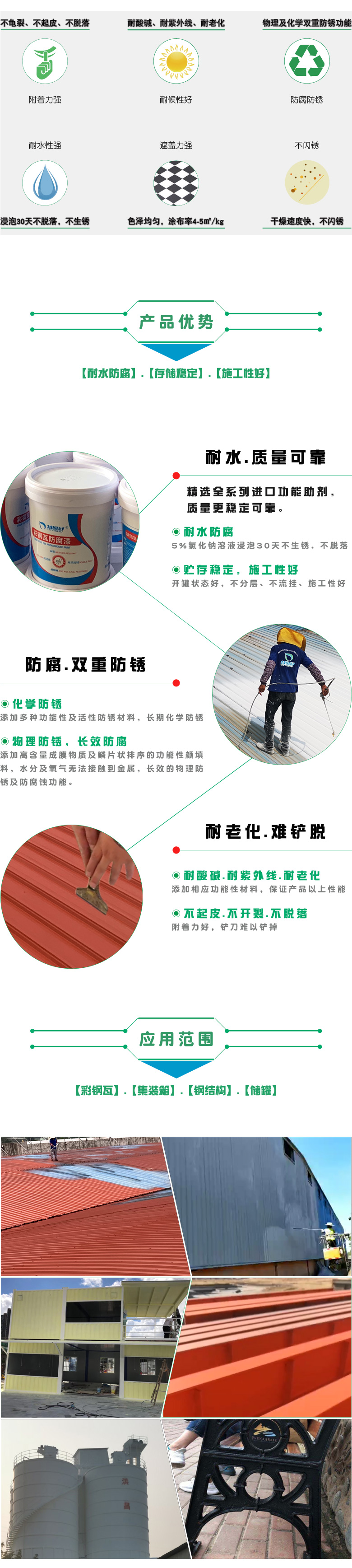 該產品具備耐水、耐酸堿、耐紫外線、耐老化及雙重防銹性能,滿足工業環境下的耐候、防腐及防銹性能要求,產品不開裂,不起皮、不脫落。