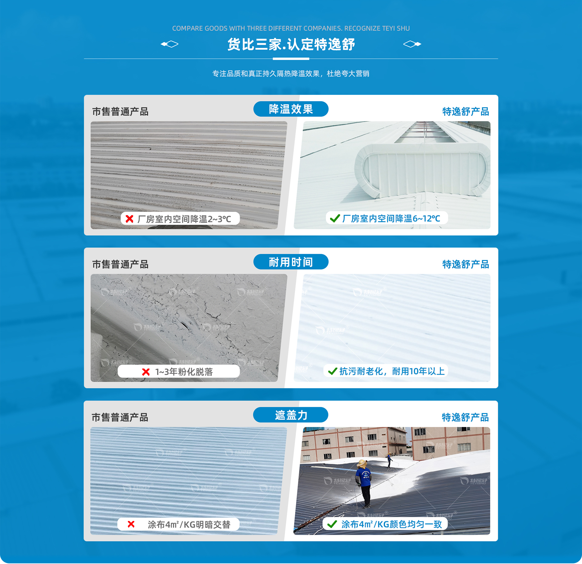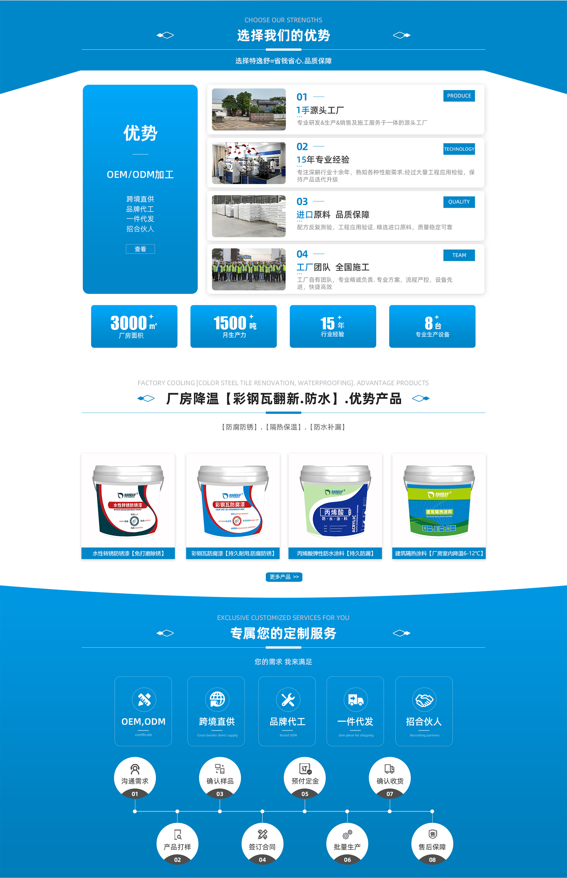 本公司是一家以研發、生產、銷售、工程配套施工服務為一體的科技型企業,“ 特逸舒”是公司旗下主要的品牌,致力于水性工業漆、帶銹轉銹涂料、防腐涂料、反 射隔熱涂料、隔熱保溫涂料、彩鋼瓦水性防腐漆、鋼結構水性防腐漆等水性環保節能 功能性涂料及特種涂料的研發。將“環保節能、低碳生活”思想貫穿于生產管理、產 品創新之中,所有產品均不含甲醛、鉛、汞等有害物質,voc含量符合國家標準,是 名副其實的無害環保產品。