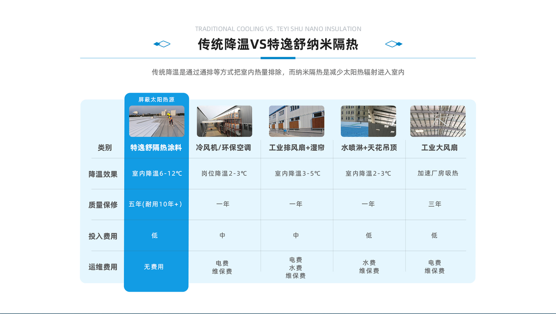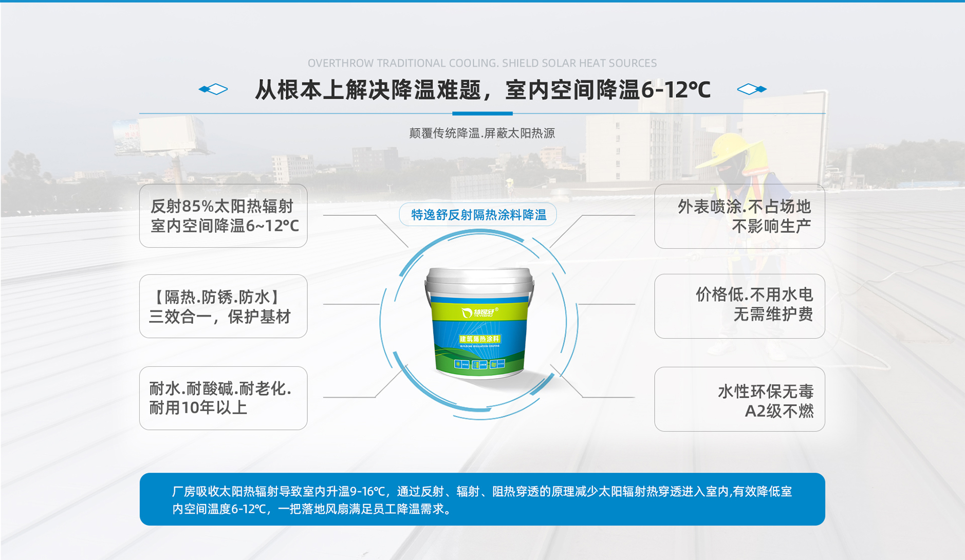 車間降溫神器,特逸舒建筑隔熱涂料是集反射、輻射與阻隔三種隔熱機理于一體的新型節能涂料,涂料能對380nm--2500nm范圍的太陽紅外線和紫外線進行高反射,不讓太陽的熱量在物體表面進行累積升溫,又能自動進行熱量輻射…