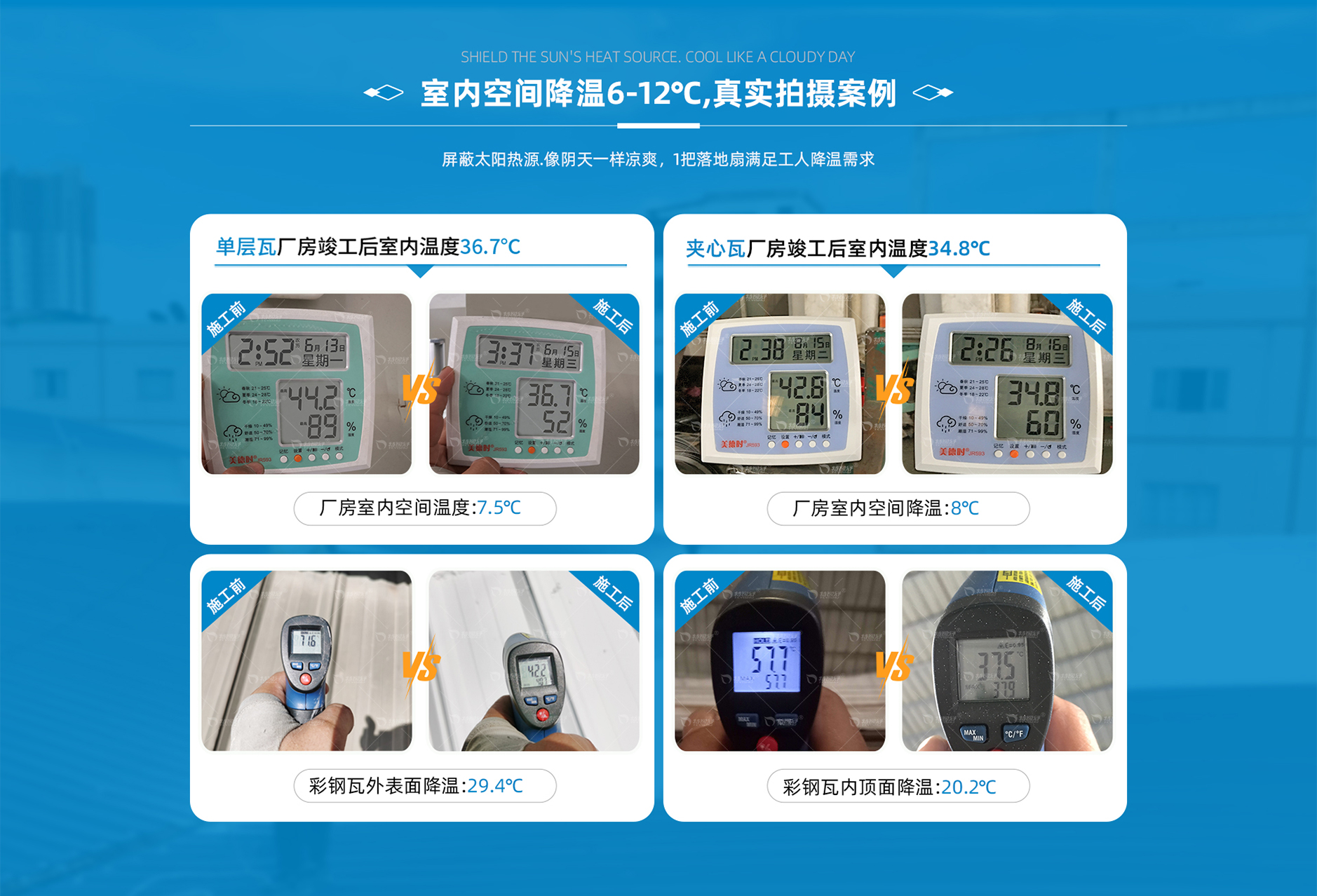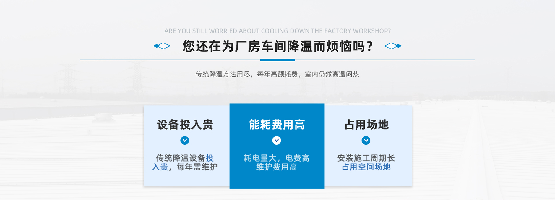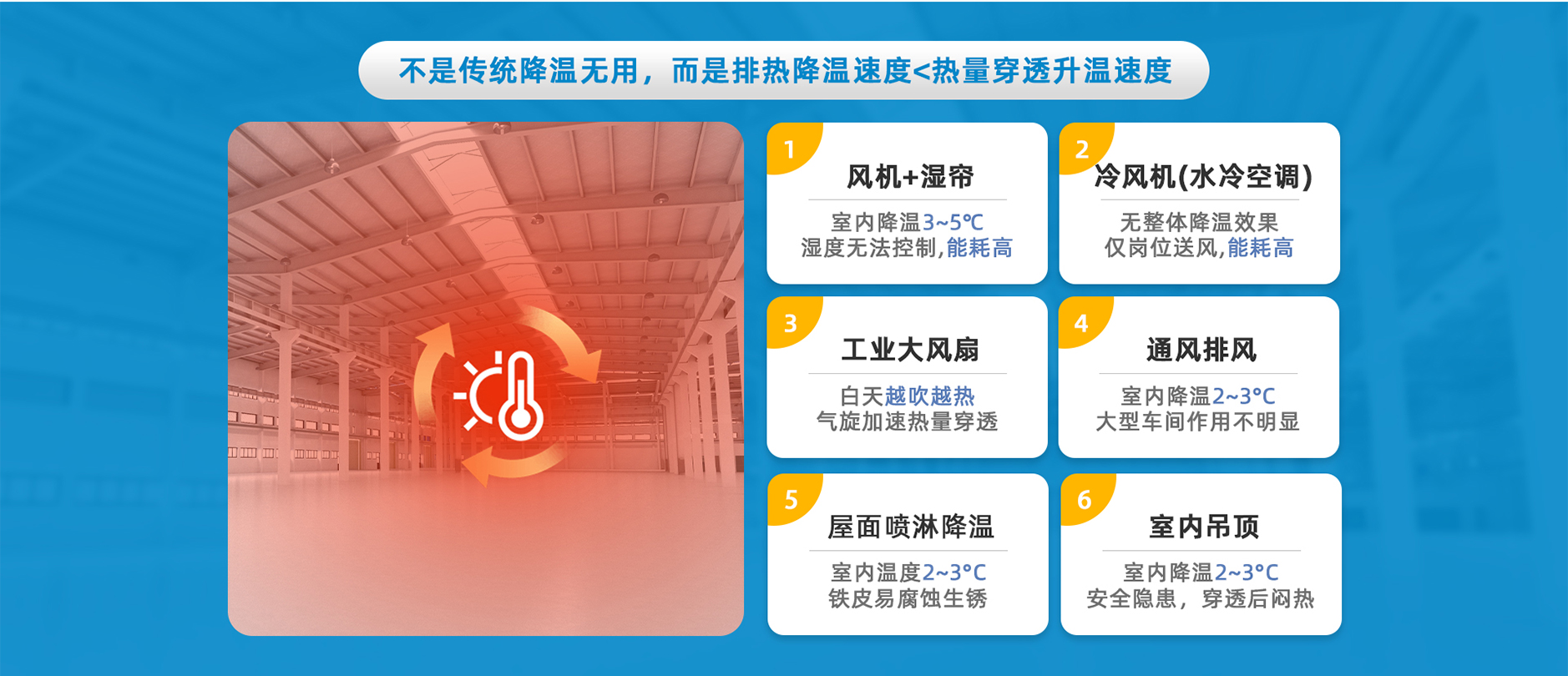 夏天高溫悶熱,傳統車間降溫方法主要以白鐵通風、負壓風機、中央空調、水簾等,廠房吸熱速度加劇,遠遠大于降溫速度,導致車間悶熱,能耗高,依舊感覺熱量從頭頂上下壓,悶熱,車間降溫最好的方式是從熱源解決…